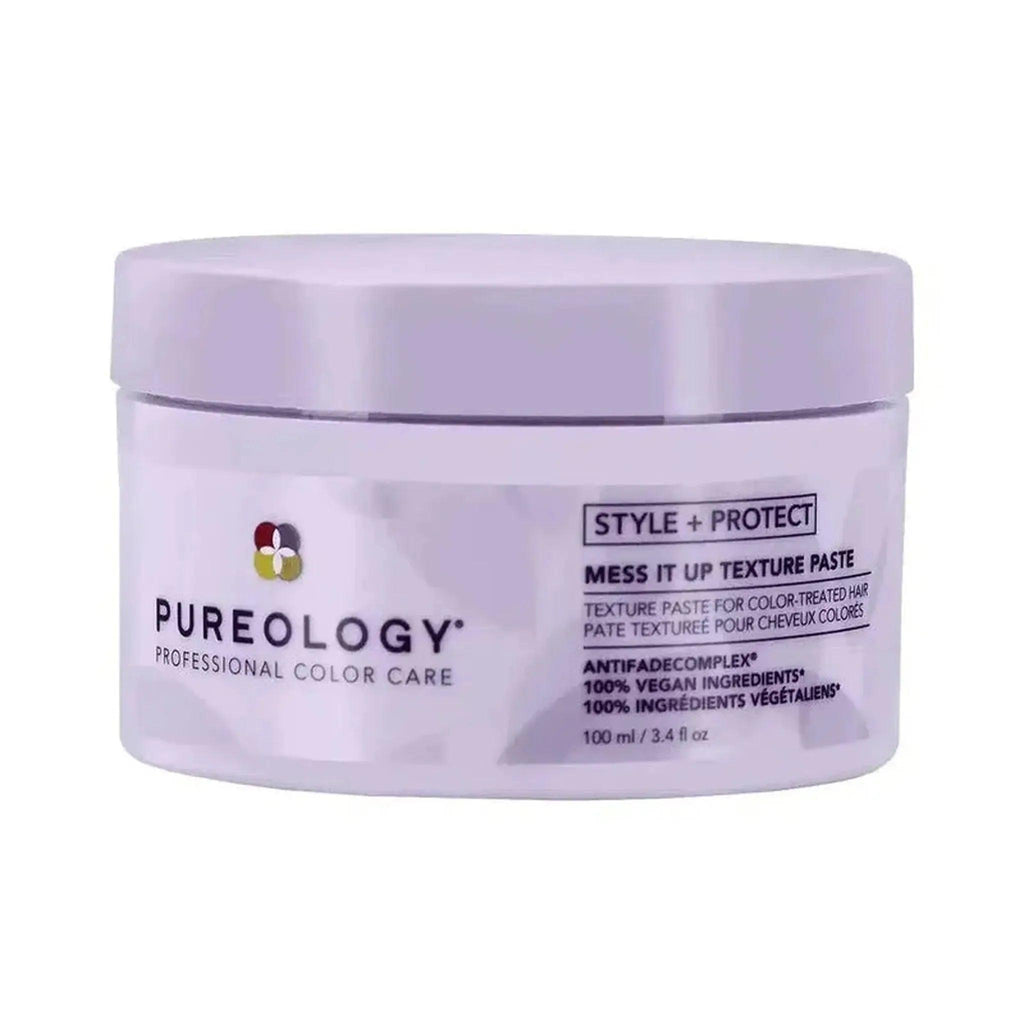 Pureology Mess It Up Texture Paste provides flexible control soft texture and shine to color-treated hair with key ingredient Vegetable Protein and a signature aromatherapy blend of Tuberose Almond Milk and Cedarwood. Pureology is the #1 Professional Color Care Brand in the US* with formulas that are 100% Vegan and free from Sulfates Parabens Mineral Oil Animal Products or by-products and Animal Testing. Our patented Antifade Complex® is infused into every formula to protect color vibrancy and ensure lasting color payoff. Sunflower Seed a UV Filter and Vitamin E fight color-depleting environmental effects while ensuring lasting shine. Our dual-benefit formulas provide color protection and customized care to address individual hair needs.